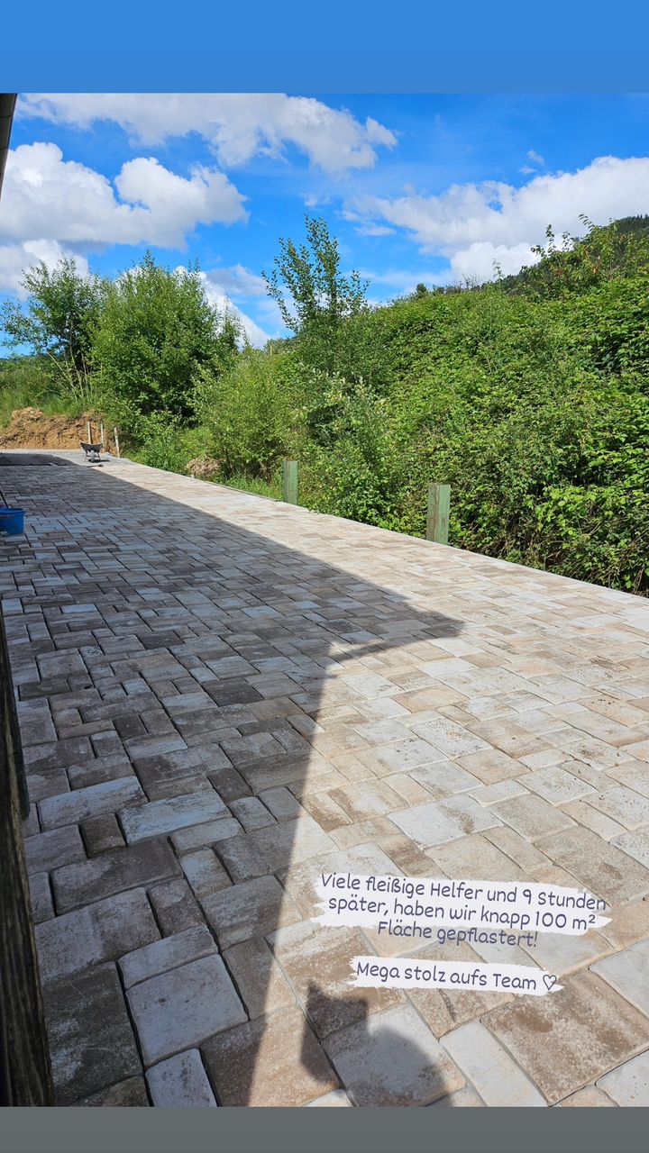 Viele fleißige Helfer und 9 Stunden später haben wir knapp 100qm Fläche gepflastert. Wir sind mega stolz auf das Team.